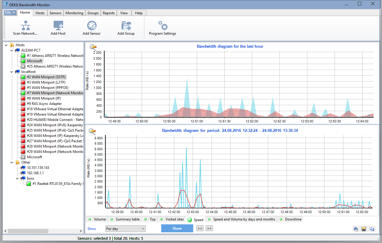DEKSI Bandwidth Monitor scans a local area network, automatically obtains the list of available hosts, and generates a hierarchical monitoring list. With DEKSI Bandwidth Monitor you can add and set the sensors for each host interface. DEKSI Bandwidth Monitor scans the sensors and obtains the volume of data values which run through them.